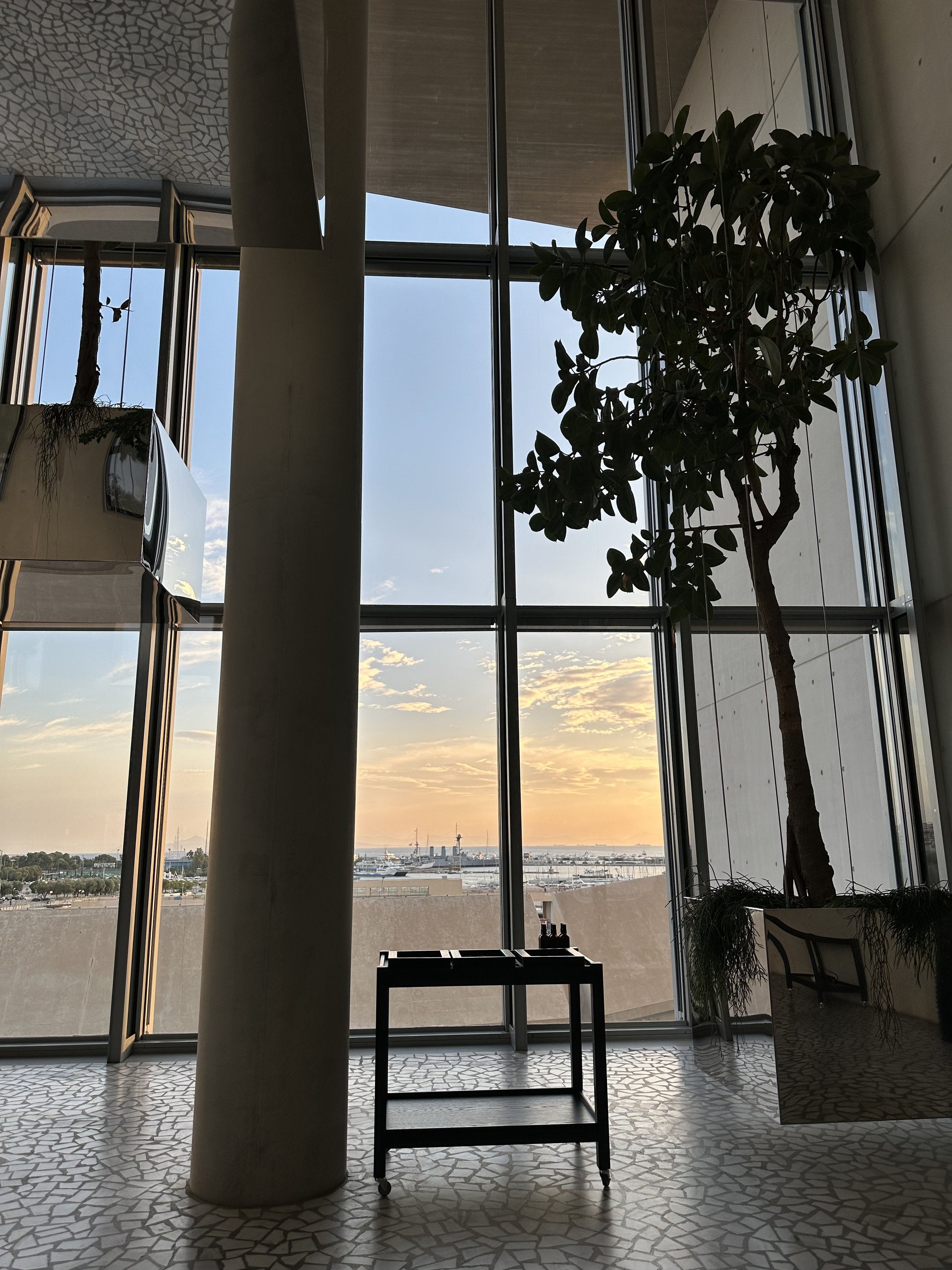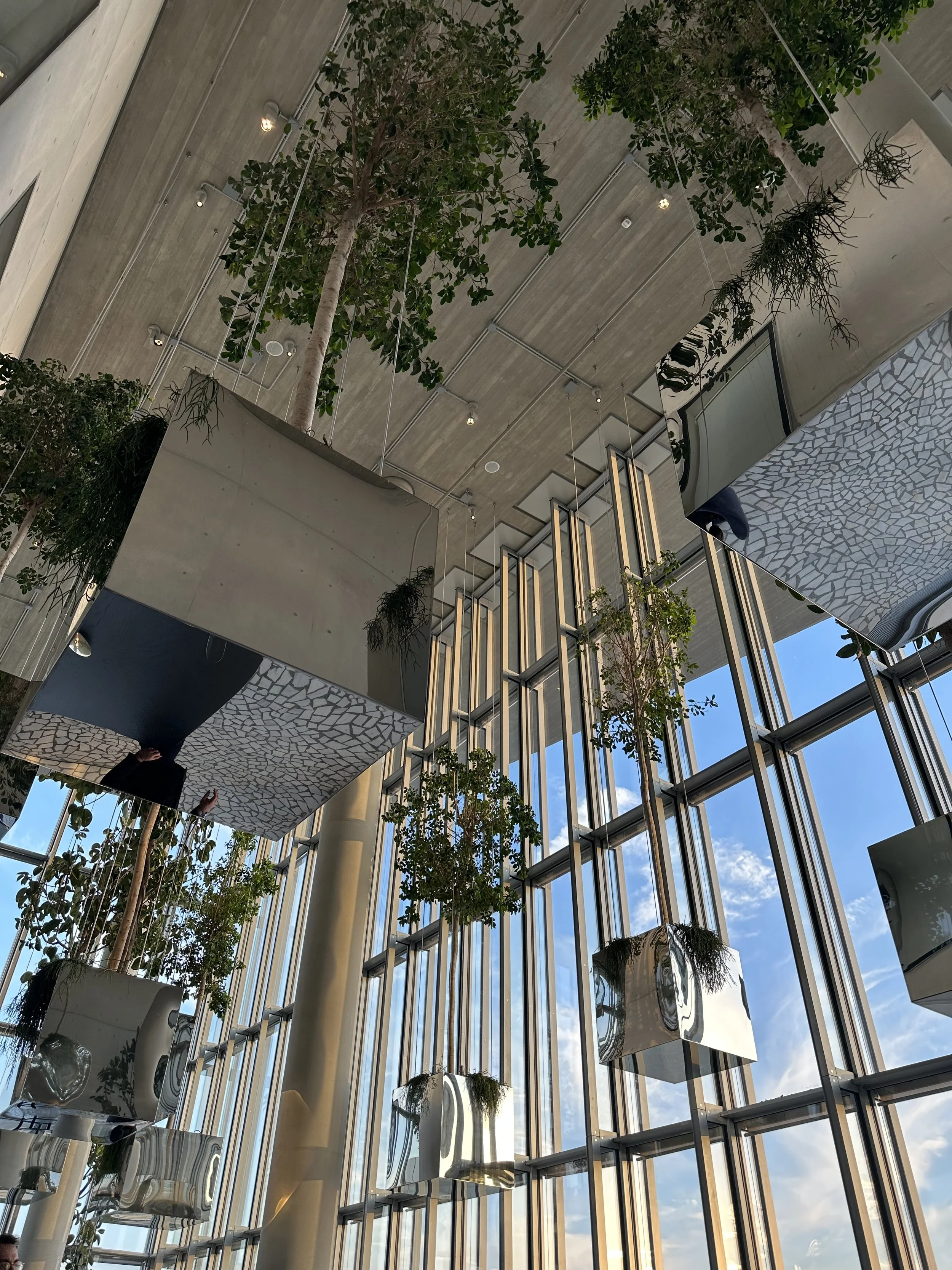 Delta is located inside the Stavros Niarchos Foundation Cultural Centre, an avant-garde complex that also houses the National Library of Greece and the Greek National Opera. This restaurant, on the fifth floor of the building, came as a pleasant surprise thanks to the design of its dining spaces as well as other details such as the dreamlike trees suspended from the ceiling, and the impressive sea views.