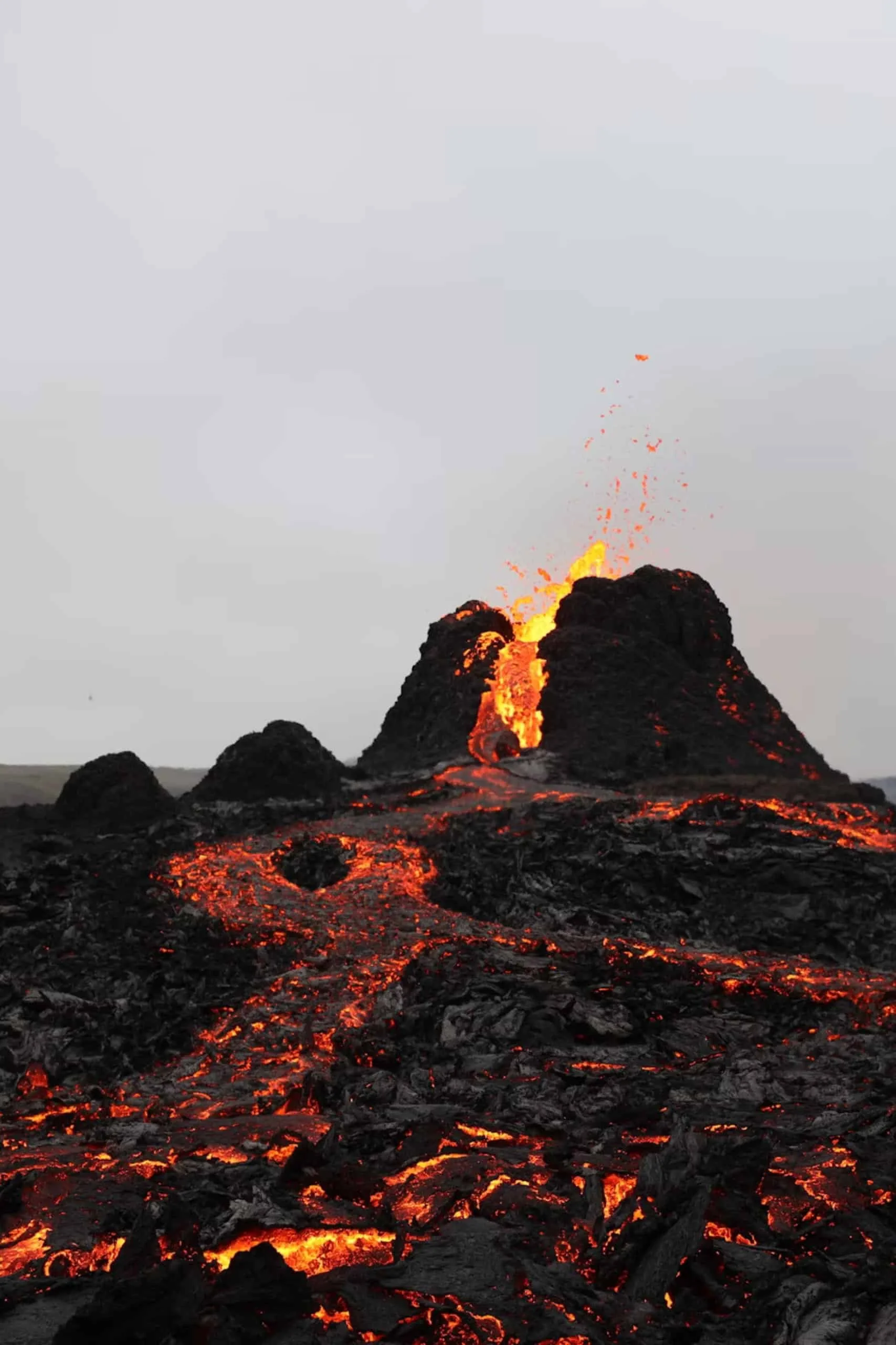As we walk to our minivan, all is revealed: Sven explains there was a volcanic eruption just two days ago and we will get to see it en route to the Blue Lagoon. “But don’t try to get close to it,” he warns with a slight smile, referencing the fact that many foolishly do. As we slow at the closest point on the road, I’m surprised the entire area is marked only by a few modest road signs, despite the jagged monolithic piece of black rock spewing molten lava in the distance amid thick smoke. Surrounding it are trickles of lava running down the crevices like glowing orange veins.